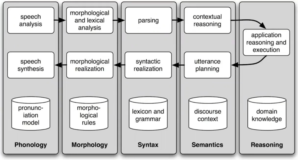 Las tareas de NLP desempeñan un papel integral en el procesamiento del lenguaje natural. Estas tareas involucran diversas técnicas y algoritmos que permiten a las computadoras interpretar y procesar el lenguaje humano. Una de las tareas de NLP más importantes es el reconocimiento de entidades nombradas, que consiste en reconocer y clasificar entidades nombradas como personas, organizaciones y regiones en un texto determinado. Esta tarea es indispensable para aplicaciones como la recuperación de información y los sistemas de respuesta a preguntas. Además, el análisis de sentimientos es una tarea importante de NLP que busca determinar el tono emocional o sentimiento expresado en un texto. Al analizar el sentimiento, los sistemas de NLP pueden obtener información sobre la opinión pública, la retroalimentación de los clientes y las tendencias en las redes sociales. Además, la resumenización de texto es una tarea central de NLP que consiste en condensar un texto largo en un resumen más corto conservando su información clave. Esta tarea es especialmente útil para la extracción de información y la categorización de documentos. En general, las tareas de NLP contribuyen al desarrollo de sistemas inteligentes capaces de comprender y procesar eficientemente el lenguaje humano. Para ello los subcampos utilizados para el NLP son la fonología, morfología, sintaxis, semántica, y el propio razonamiento, que podemos ver estas estructuras en el siguiente esquema gráfico: